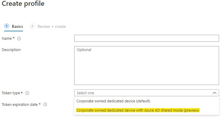 - From the Token type drop-down menu select the Corporate-owned dedicated device with Azure AD shared mode option;
