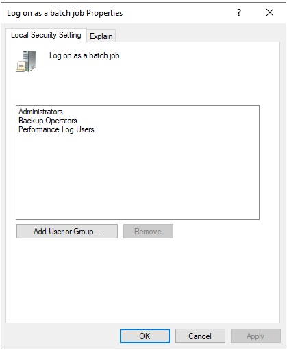 - Make sure that the local account you want to use has Log on as a batch job rights