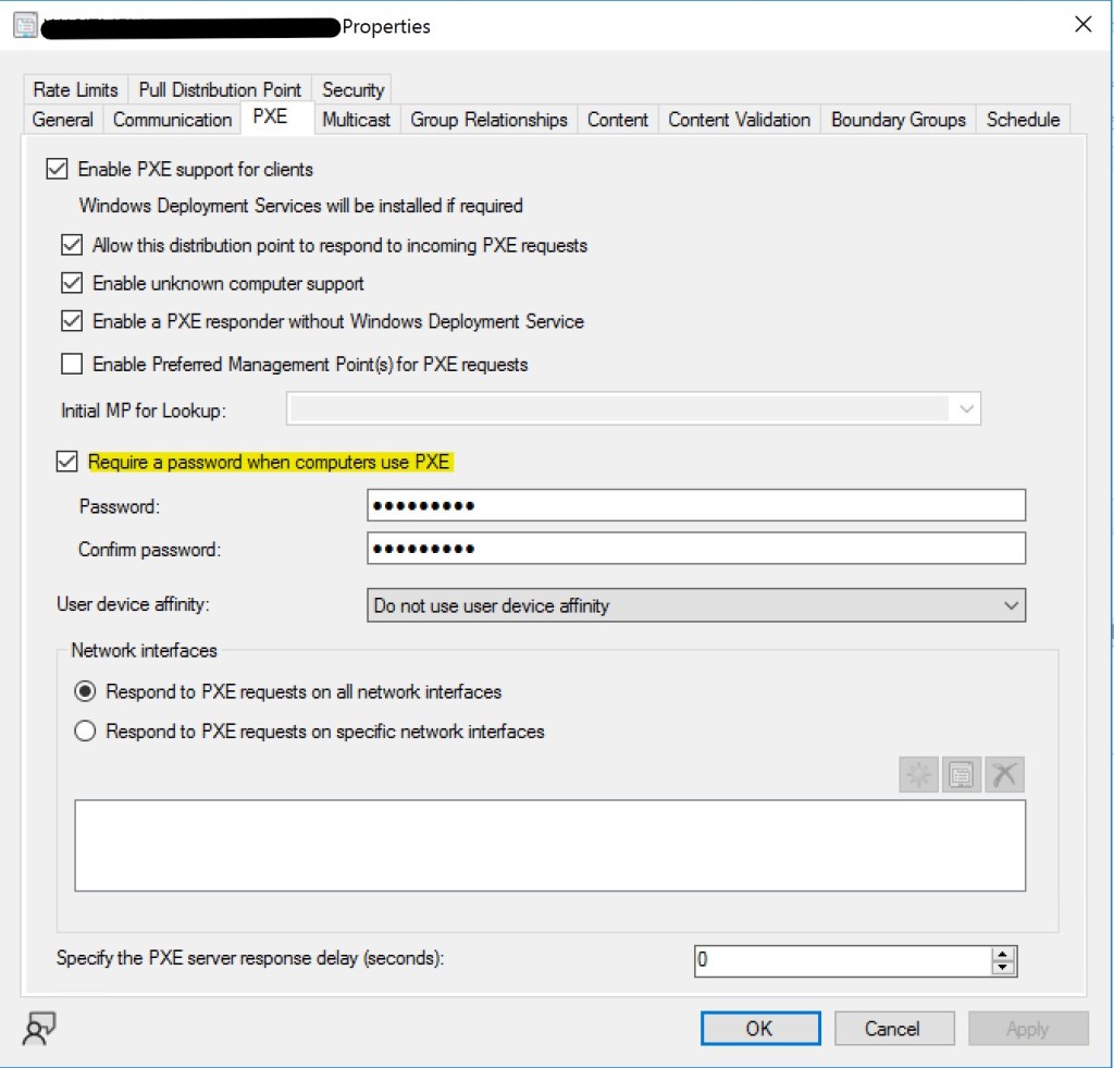 To solve the issue, we changed the configuration of our DP/PXE server in order to request a password when devices use PXE: