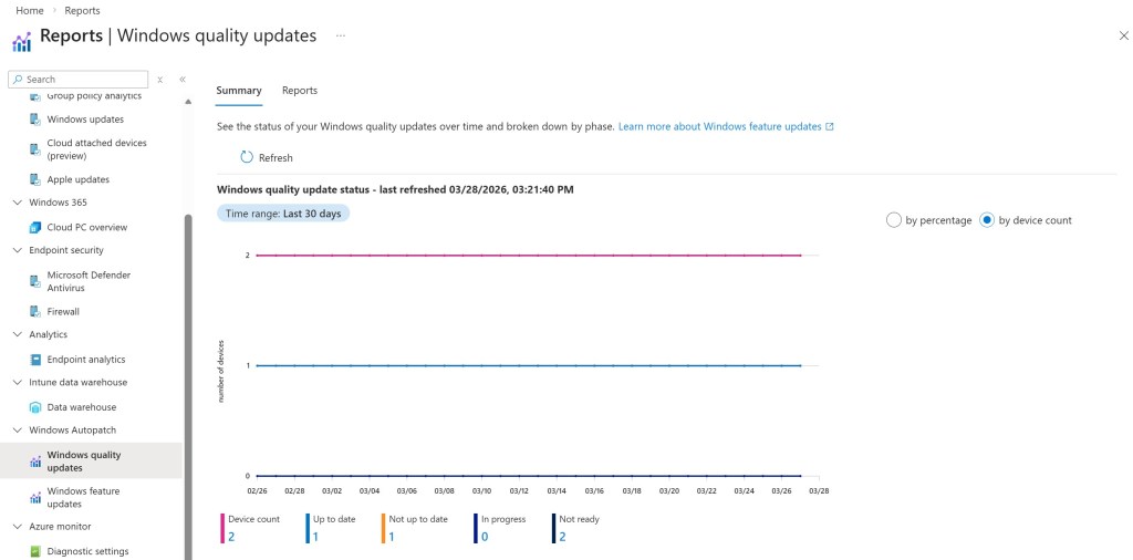 | Autopatch Management Status Report | Quality update/Feature update | Details | Provide a tenant-wide view of all Windows devices managed by Intune, including those not covered by update policies or not enrolled in Windows Autopatch |