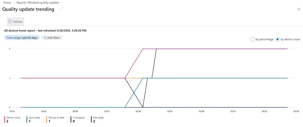 The strength of this dashboard is its immediacy, as it allows you to quickly understand whether the monthly update cycle is proceeding smoothly or whether critical situations are present. For example, an increase in “not ready” devices may indicate that the issue isn’t related to a single update, but rather to a more general readiness condition. Conversely, a high number of devices in “in progress” status for an extended period may be indicative of user experience issues, such as users failing to reboot, or issues with updates during installation or content distribution.