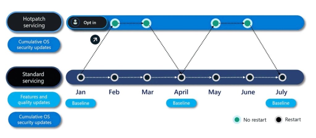 It’s important to note that Hotpatch doesn’t eliminate reboots entirely, but it does reduce their frequency. Microsoft uses a cyclical model to distribute specific updates called Baseline updates in specific months of the year (January, April, July, and October), which require a reboot. In subsequent months, security updates are distributed in hotpatch mode, meaning they don’t require a reboot.