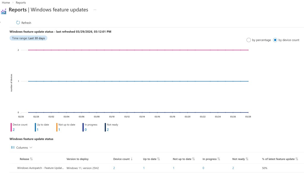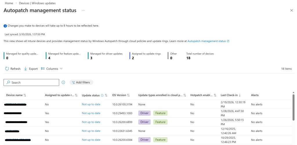 One of the most common pitfalls when reading reports is the assumption that if the update dashboard shows a positive status, then all devices are properly updated. In reality, a significant portion of systems may not have been correctly targeted or are not yet managed by the expected model. To this end, Microsoft provides a report called Autopatch management status report (located in the Devices > Windows updates > Monitor section) that provides a tenant-wide view of all Windows devices managed by Intune, including those not yet covered by update policies or not correctly enrolled in Windows Autopatch.