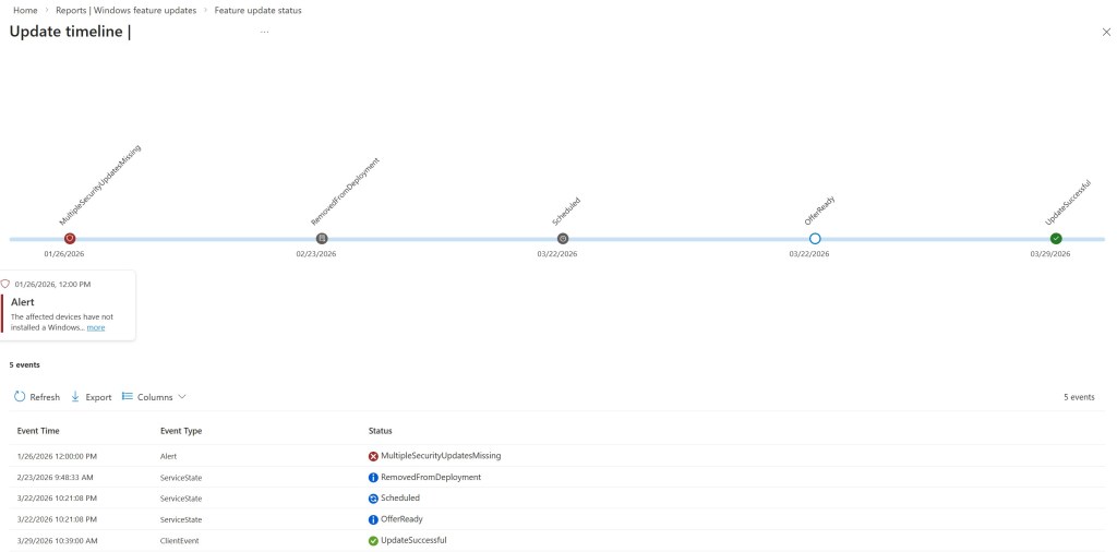 One of the historical limitations of update reporting has been the use of overly generic statuses, such as “In progress,” which often fail to provide a clear understanding of what’s actually happening on the device. The Feature Update Journey was created precisely to overcome this limitation, offering a more detailed view of the path devices follow throughout the entire update process.