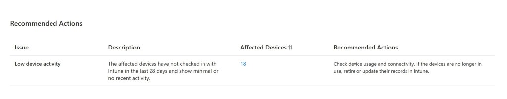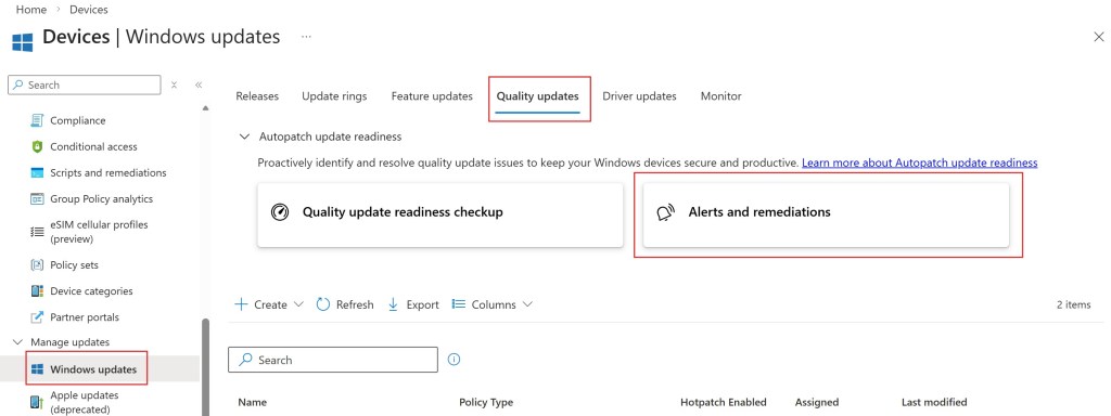 | Alerts and Remediations | Quality update/Feature update | Overview | Highlight issues that may compromise the ability of devices to stay up-to-date or compliant |