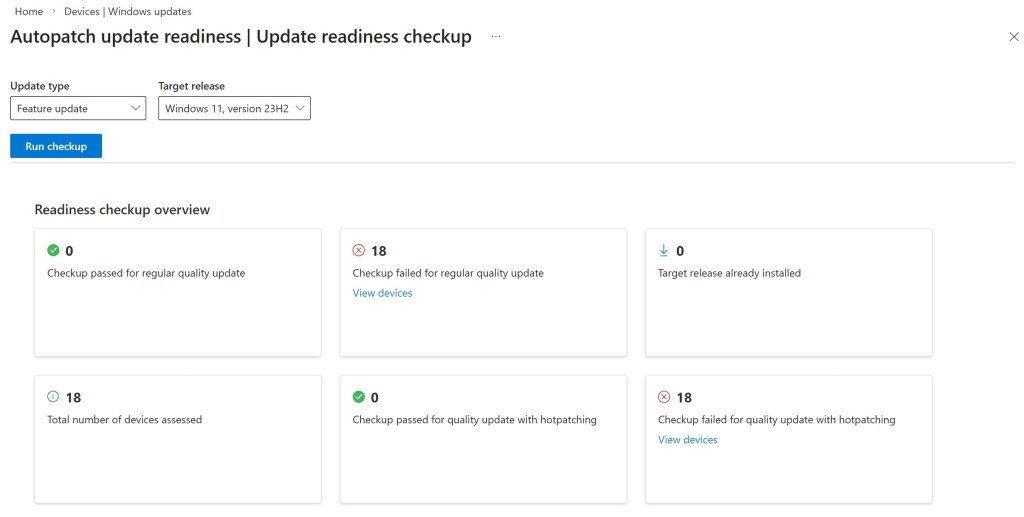 Within the Feature updates and Quality updates tabs under Devices > Windows updates, there are two sections called Feature update readiness checkup and Quality update readiness checkup, respectively, which link to the same report: Update readiness checkup. This report allows you to verify in advance whether your devices are actually ready to receive quality updates or feature updates.